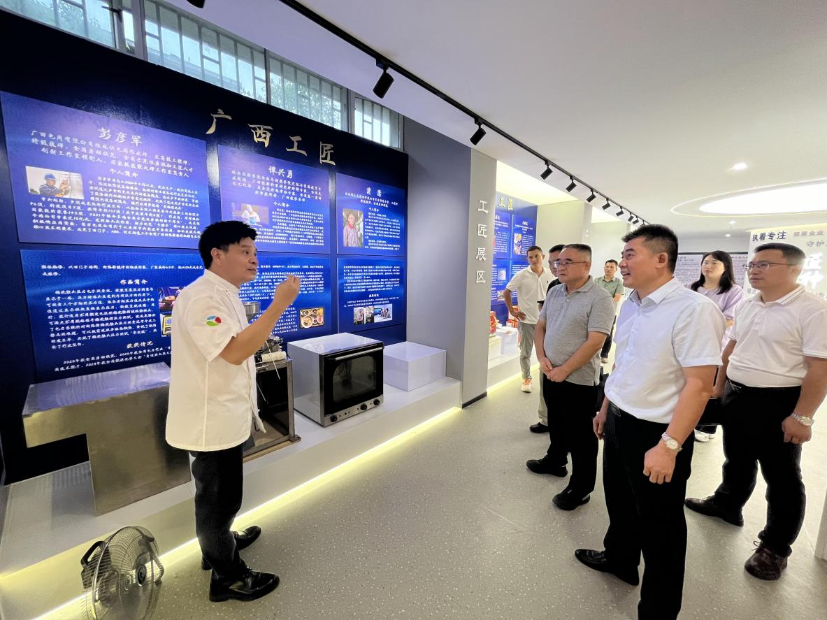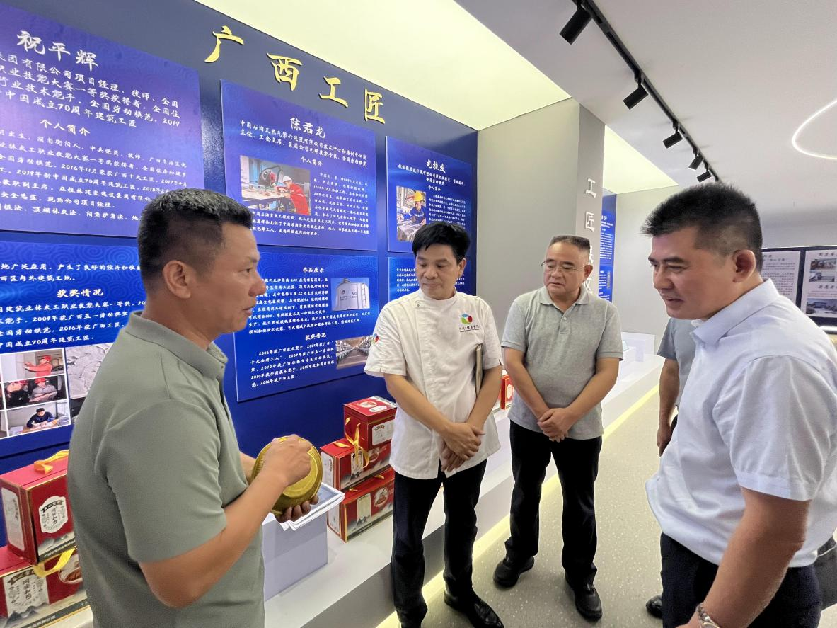 在桂林工匠展厅,调研组驻足“工匠风华”墙前,认真听取25 位“广西工匠”和131位“桂林工匠”的事迹与贡献介绍。通过实物展、代表作和影像资料,调研组深切感受到“执着追求、精益求精、一丝不苟、追求卓越”的工匠精神内核。期间,苏琰凌与全国先进工作者谭兴勇、自治区级非遗项目传承人周林泽等工匠代表亲切交流,细致询问他们在技术研究、工艺创新、非遗传承等方面的进展与成效,对他们长期扎根一线、专注技艺钻研、弘扬工匠精神给予高度评价,现场氛围热烈而融洽。
