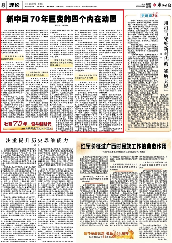 概言之,新中国从站起来、富起来到强起来的沧桑巨变,其背后起决定作用的内在动因关键在于四个“拥有”,即为了伟大的事业,伟大的中国共产党带领伟大的中华民族进行了70年艰苦卓绝的伟大斗争,在华夏大地上实现了举世瞩目的沧桑巨变。而这“四个拥有”恰恰折射出习近平总书记提出的“四个伟大”的内在精髓。伟大梦想、伟大事业、伟大工程和伟大斗争不断为新中国增添着崭新的内涵,不断为中国人民创造出更加美好的新生活,也不断为中华民族铸造出崇高而伟大的国际形象。