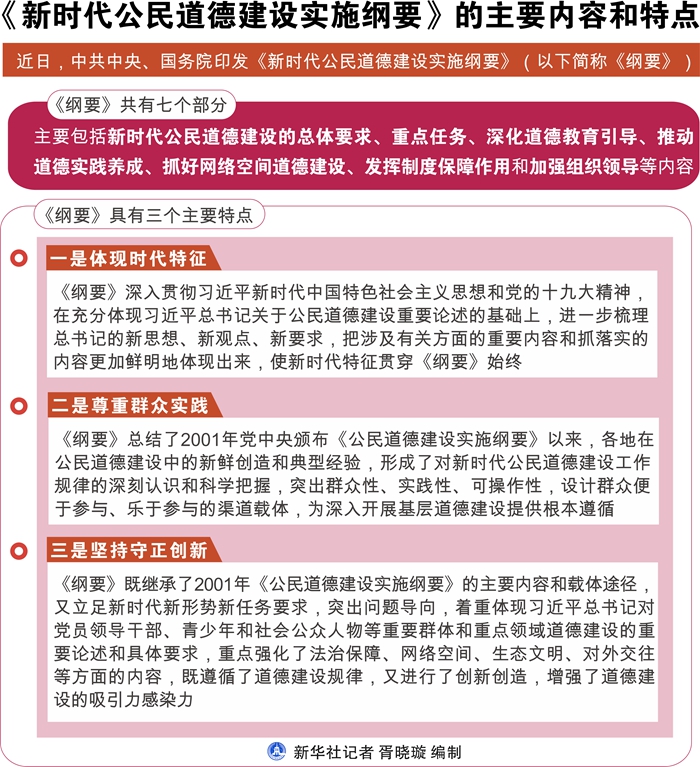 《纲要》具有三个主要特点:一是体现时代特征。《纲要》深入贯彻习近平新时代中国特色社会主义思想和党的十九大精神,在充分体现习近平总书记关于公民道德建设重要论述的基础上,进一步梳理总书记的新思想、新观点、新要求,把涉及有关方面的重要内容和抓落实的内容更加鲜明地体现出来,使新时代特征贯穿《纲要》始终。二是尊重群众实践。《纲要》总结了2001年党中央颁布《公民道德建设实施纲要》以来,各地在公民道德建设中的新鲜创造和典型经验,形成了对新时代公民道德建设工作规律的深刻认识和科学把握,突出群众性、实践性、可操作性,设计群众便于参与、乐于参与的渠道载体,为深入开展基层道德建设提供根本遵循。三是坚持守正创新。《纲要》既继承了2001年《公民道德建设实施纲要》的主要内容和载体途径,又立足新时代新形势新任务要求,突出问题导向,着重体现习近平总书记对党员领导干部、青少年和社会公众人物等重要群体和重点领域道德建设的重要论述和具体要求,重点强化了法治保障、网络空间、生态文明、对外交往等方面的内容,既遵循了道德建设规律,又进行了创新创造,增强了道德建设的吸引力感染力。